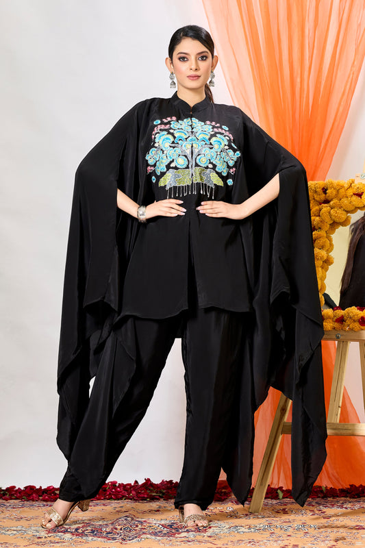 SummerFalling-Black Embroidered Banarasi Silk Cape Set