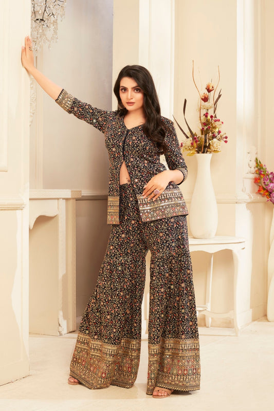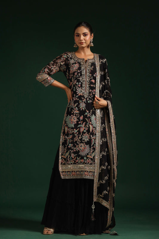 SummerFalling-Black Embroidered Premium Georgette Sharara Set