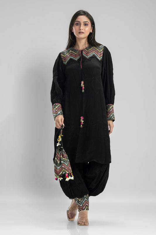 SummerFalling-Black Embroidered Premium Silk Patiala Pants Set