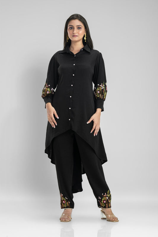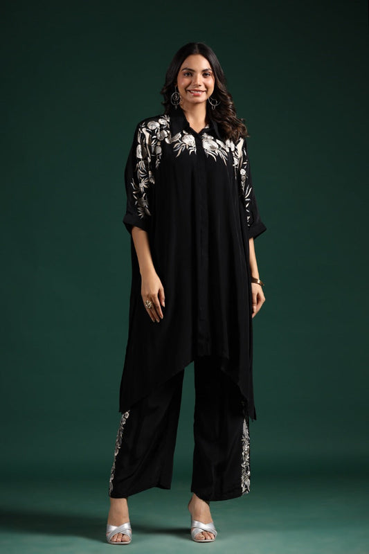 SummerFalling-Black Embroidered German Silk Co-Ord Set