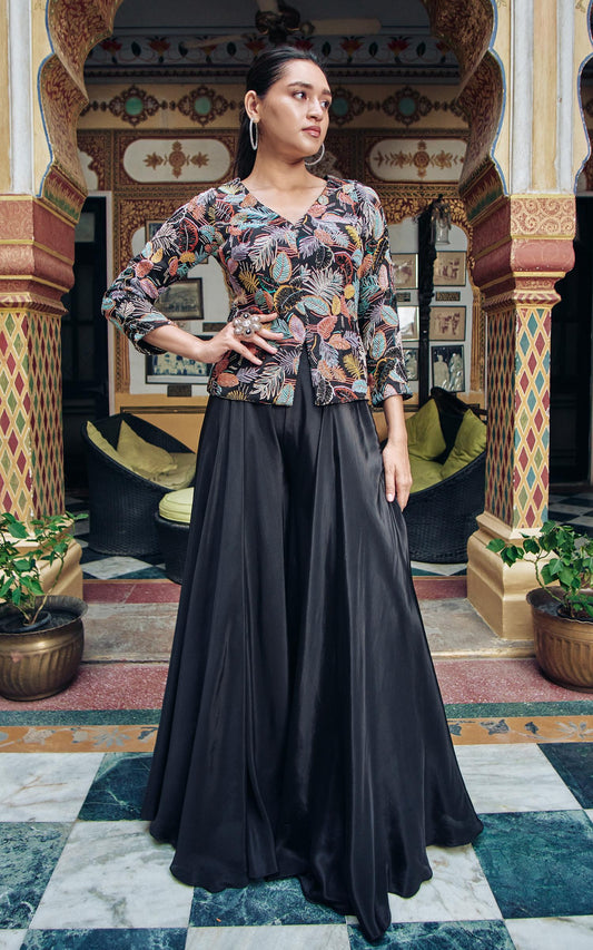SummerFalling-Black Embroidered Habutai Silk Palazzo With Top